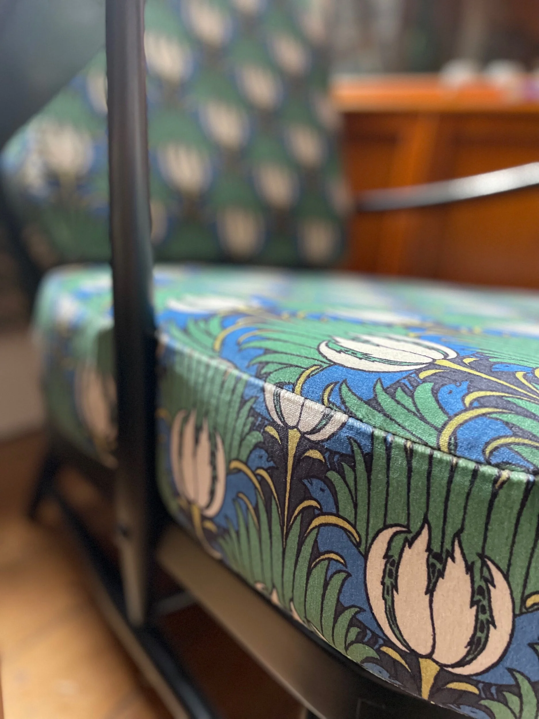 An iconic midcentury chair which has has been refurbed for a new life. An original Ercol Windsor armchair sprayed in a sleek black and re-webbed. New cushions have been created in this tactile art deco inspired Tulips and Birds velvet from the Sanderson Archive collection in blue and green.